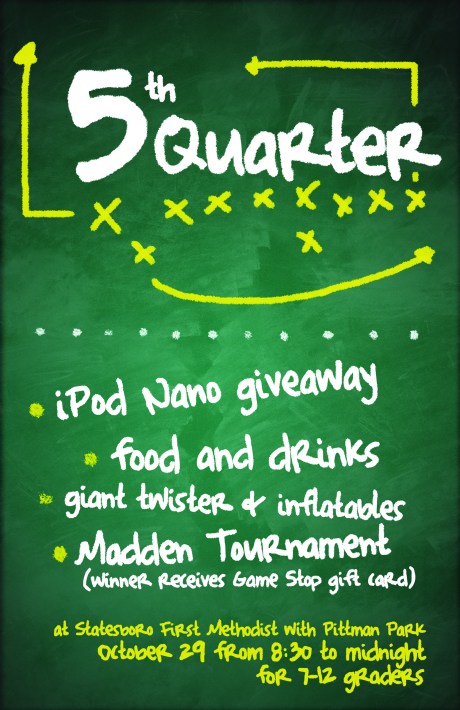 Go ahead and mark your calender down, because on October 29th we will be having the coolest, most amazing 5th quarter ever! We will be partnering with Pittman Park UMC to have inflatable games, a Madden tournament with a $50 gift card to Game Stop, food, and an Ipod nano raffle! We will kick things off around 8:30p.m. and go till midnight. Head on over as soon as Statesboro beats Green Briar. Bulloch Academy is off this weekend.