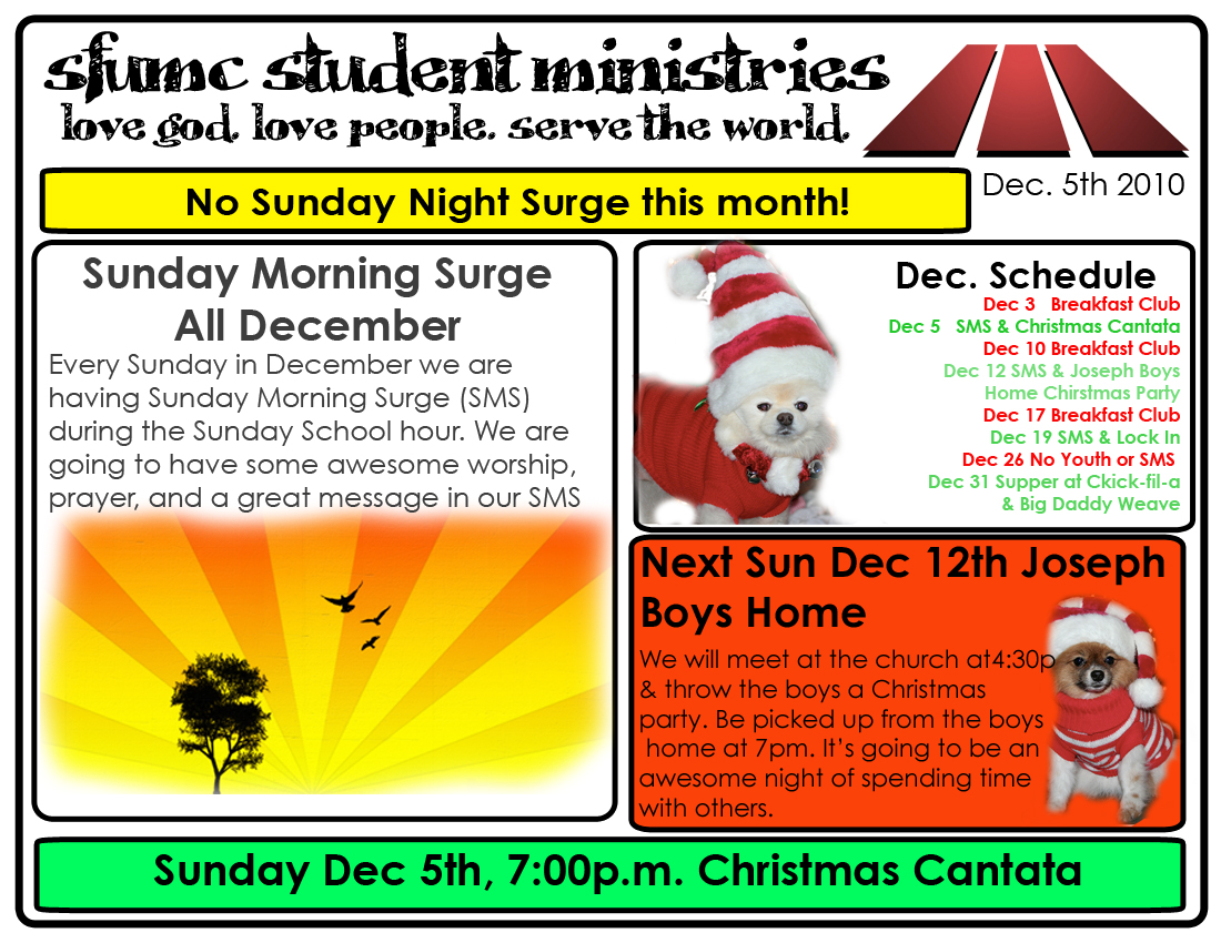 Here’s a look at some of the information that went out over the Thanksgiving break in case you missed it. I’m so excited about our December schedule and the upcoming Holiday season. We have so much going on and we know that you do to. To make things easier we are doing our weekly service during Sunday School. We will have worship, games, and a great message in our Sunday Morning Surge Series – Christmas Stories. We will be taking a look at what it means to celebrate Christmas.