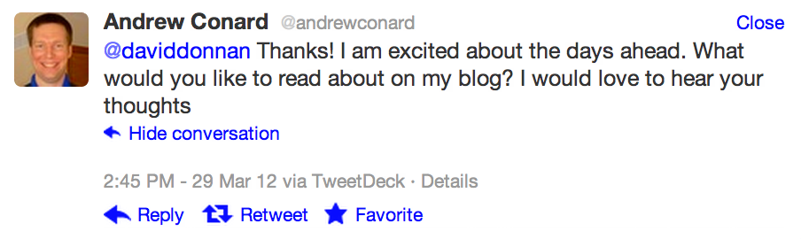 Andrew, thanks for having a great blog and sharing with others! Here are some brief notes on what I would like to hear.